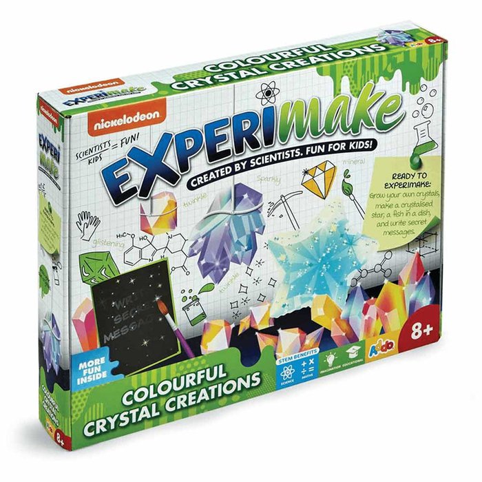 Make all kinds of colourful creations with this Nickelodeon Experimake Crystal Creations Science Kit. Kids can enjoy lots of cool experiments and discover everything they need to grow their own crystals, make a crystallised star, a fish in a dish, or even write secret crystal messages! Kids can prepare to unleash their inner scientist with Nickelodeon Experimake. Discover colourful creations and grow unique crystals with the Crystal Creations Science Kit from Experimake. Comes with everything required for kids to grow their own crystals, make a crystallised star, and more. Experimake: created by scientists, fun for kids.