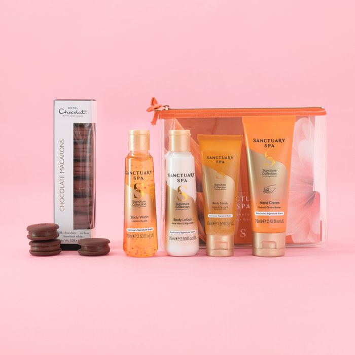 Our take on the French patisserie: light praline whip between mellow 40% milk chocolate discs. Chocolate Macarons with a twist paired with a treasure trove of must-have miniatures by Sanctuary Spa