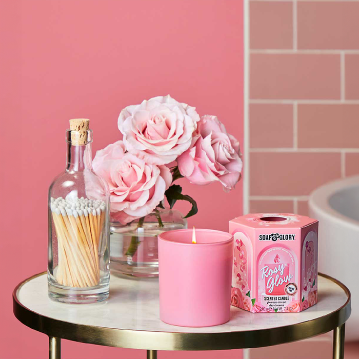 Get cosy and light up your senses with that… Soap & Glory ROSY GLOW™ Scented Candle. Indulge in a moment of bliss with our fruity floral signature Soap & Glory scent of Rose and Bergamot.