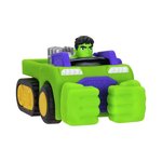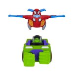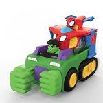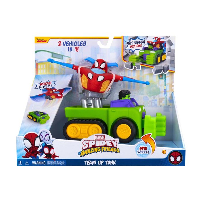 Featuring two unique vehicles including Spidey and Hulk, this heroic duo can join forces to stop baddies everywhere. First, roll out the 6-inch Hulk Smash Tank and push it forward to make its fists punch. Then, fly in the 4-inch Spidey Glider Jet, land on top of the Hulk Smash Tank, and its wings will fold down to join into one vehicle.