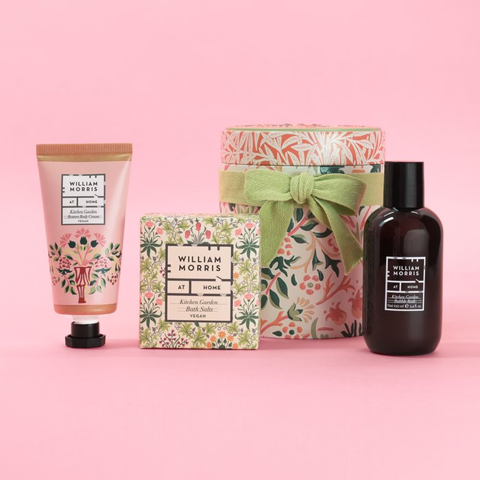 Calling all gardeners. Check out this Post-Gardening Care Flowerpot Tin, a perfect, ribbon-tied gift containing bubble bath, bath salts and body cream, a Morris print note card and a string-and-washer seeds envelope.