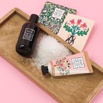 Three steps to relaxation post gardening. Relaxing bath salts with sea salt, chicory and soothing aloe, and foaming bubble bath with vitamin E and aloe. Restore Body Cream with vitamin E, cocoa butter, shea butter and macadamia oil is an enriched formula blended to leave skin feeling beautifully soft.