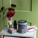 A useful and beauty-filled gift tin for fans of heritage design, finished with teal velvet bow. This round decorative tin with the Flowerpot design contains a cornucopia of treats including hand and body cream, body wash, bath salts and three William Morris print greetings cards.