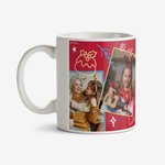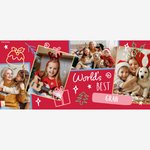 Mug design: Featuring 4 photo upload frames with playful festive doodles including holly, a Christmas pudding, stars, a gift and a tree, plus bold hand lettering, all on a red coloured background.br> Text reads: "World's best gran."