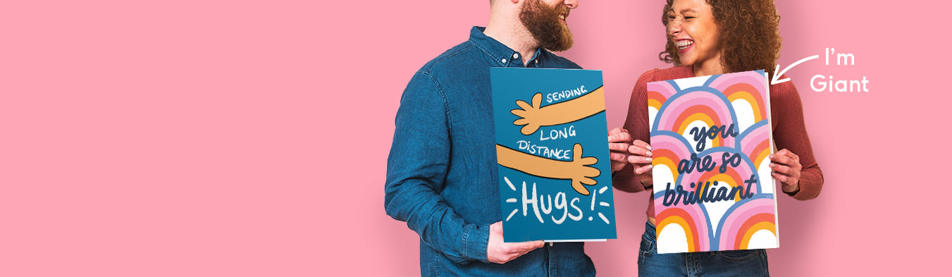 When you thought you couldn't surprise them anymore with our large cards here come our giant cards. How big is a Moonpig giant card... it's about the size of A3 sheet of paper and is designed for instant wow factor. We have giant cards for every type of occasion like Christmas, Valentine's Day, Easter and milestone events such as leaving dos, pregnancy announcements, house warming parties, anniversaries, and birthdays.