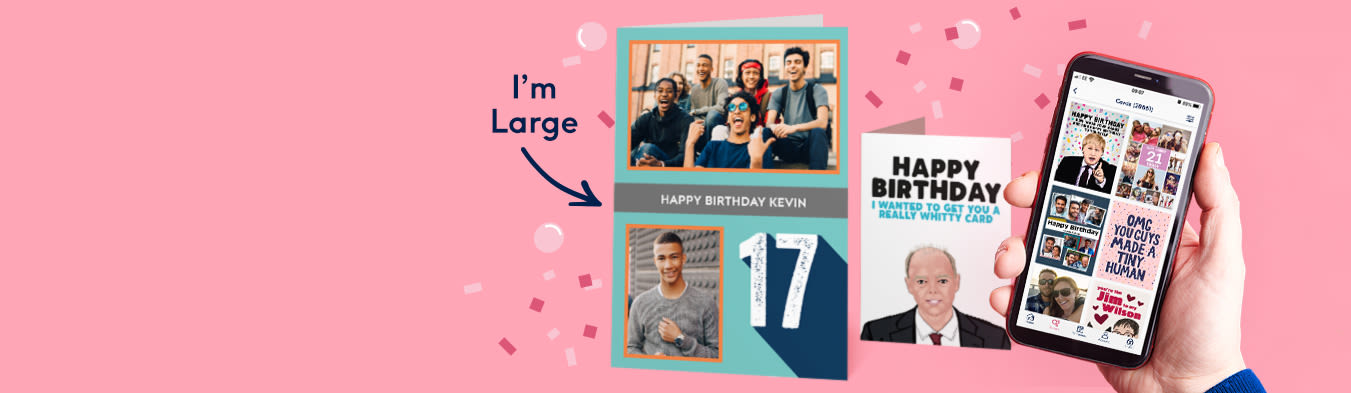 Sharing your memories in a Moonpig turns it from a card to a keepsake. They'll love the surprise of getting a large card with their name, so many photos of your best moments together, and a big message on the inside. From birthdays and anniversaries to new jobs, homes, and babies our large cards are perfect for any occasion. We have large personalised cards in all colours, designs, and styles and have ones that will make them smile, cry, or snort from all the laughs.