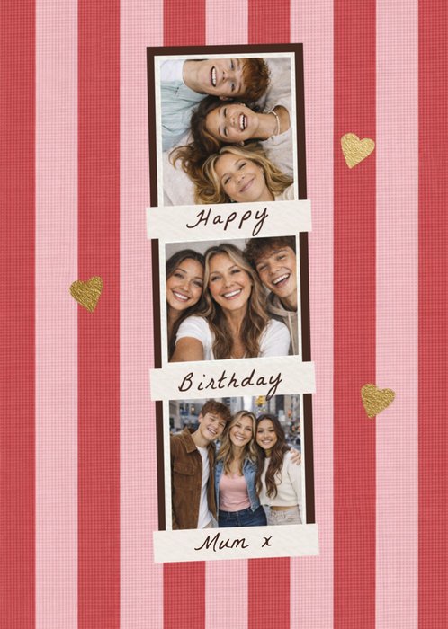 Featuring three photo frames arranged vertically with handwritten-style labels and small gold hearts, on a pink and red striped background.