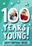 Front of card: Featuring fun in-your-face typography with stars on a teal background. There are two photo upload areas in the zeros of the number '100'.