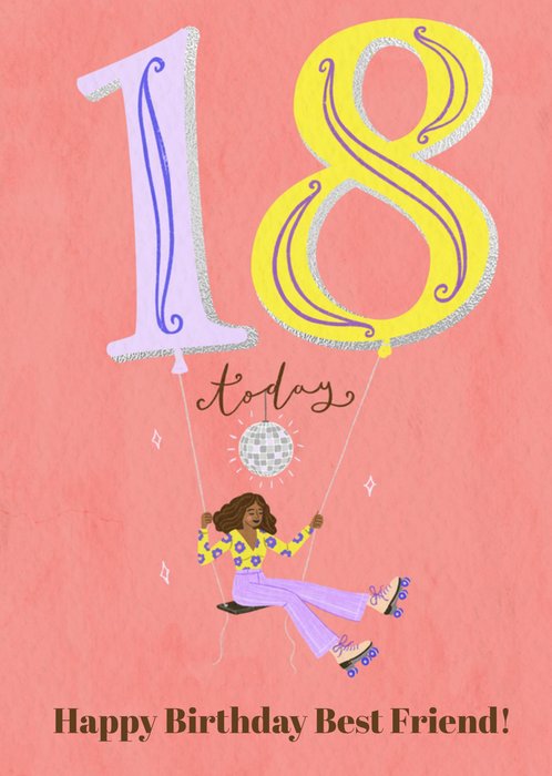 A modern, fun design featuring large colourful numbers as balloons with a person underneath sat on a swing created by the balloon strings. Below the scene is an editable message. The design sits on a textured coral pink background.
