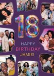 A purple background design featuring a large colourful disco-ball style “18” with the words, surrounded by eight photo upload frames.