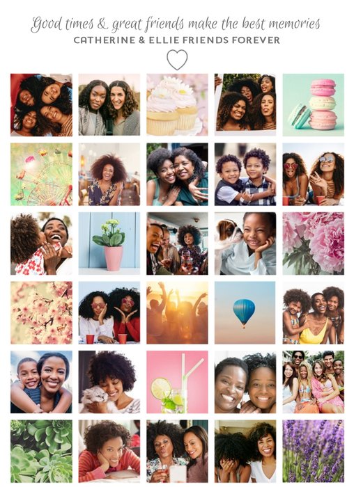 30 photo upload frame card, with text above that reads "Good times and great friends make the best memories. Catherine & Ellie, friends forever."