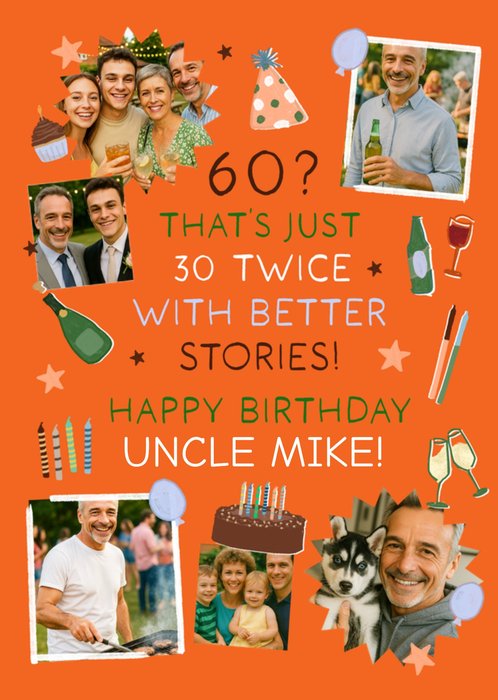 Text reads: "60? that's just 30 twice with better stories! Happy Birthday Uncle Mike!".