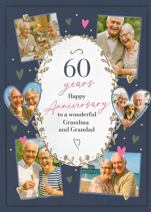 60 years Anniversary card, featuring 6 photo frames. With central text, gold foil floral and heart embellishments on a blue background.