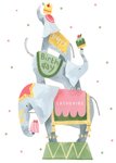An adorable Birthday card featuring a hand-painted, watercolour illustration of three circus elephants doing a balancing act on each other's backs, they reduce in size as they get closer to the top of the stack. All three elephants are holding cakes with their trunks. The design has dots in the background.