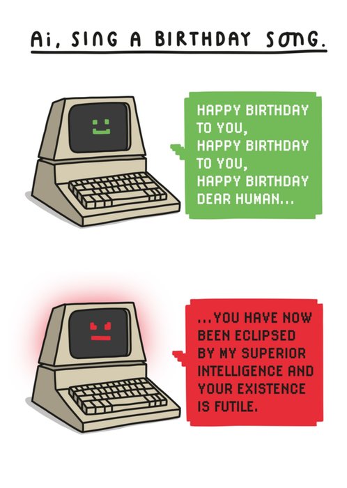 "AI sing a birthday song. Happy birthday to you, Happy birthday to you, Happy birthday dear human... You have now been eclipsed by my superior intelligence and your existence is futile.".
