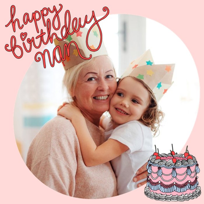 Front of card: Illustrated pink birthday cake on a pink background with round photo frame in the centre" Text reads: "Happy Birthday Nan" With editable photo.
