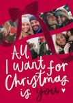 A modern design featuring a large burgundy bow and sweeping ribbon framing five photo uploads, with a festive message on a red background.
