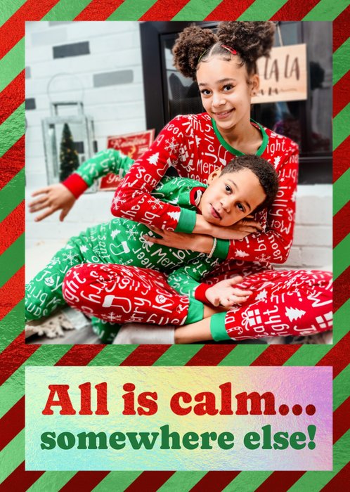 A humorous design featuring a large photo upload and an editable festive message, on a red and green striped background.