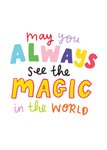A vibrant and inspiring postcard with the message "May you always see the magic in the world" in colorful, playful letters on a white background.