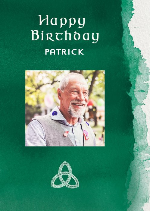 Illustrated 50th Birthday card for your son, featuring a photo upload space above a bird table with a Blue Tit on, a watering can, spade, wellies, and a wheelbarrow.