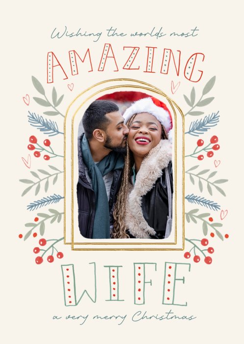 Front of card: Featuring a large photo upload in the centre of the card that is surrounded by illustrated sprigs of holly, hearts and red berries. Above and below the photo frame is green and red text. Text reads: "Wishing the worlds most amazing Wife a very merry Christmas".
