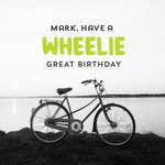 Aperture Photographic card featuring a black and white photo of bicycle. The editable part of the caption reads Recipient's name, Have A, followed by a typographic, non editable Wheelie, and then a simple Great Birthday.
