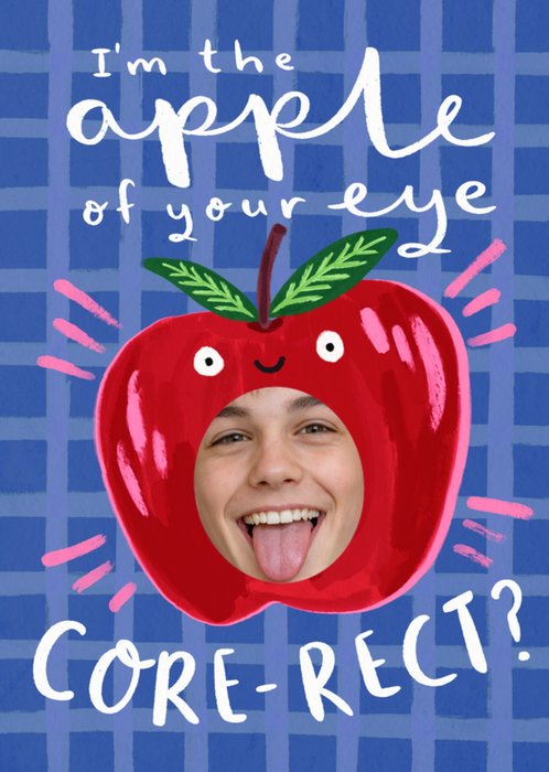 A humorous design featuring a smiling illustrated red apple character with one circular photo frame in the centre on a blue checkered background.