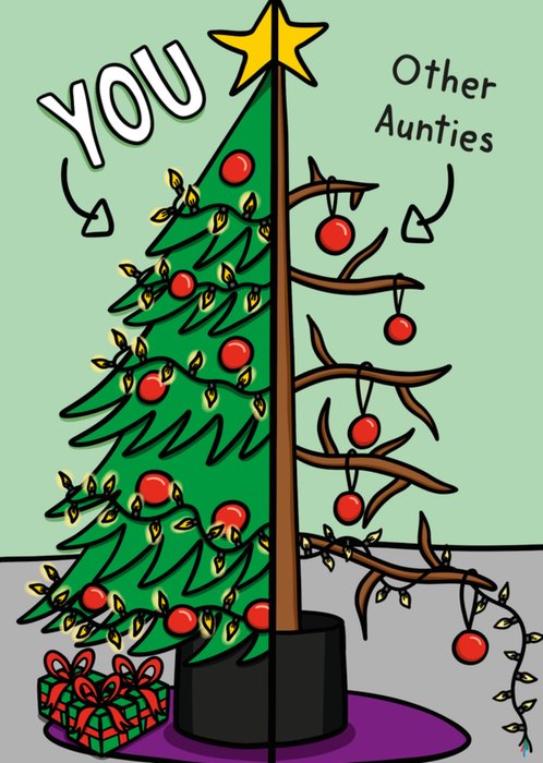 Featuring a humorous split illustration of two Christmas trees. The left side, labelled “You,” shows a bright, full green tree decorated with baubles, lights, and presents underneath. The right side, labelled “Other Aunties,” shows a sparse brown tree with a few drooping baubles and tangled lights. Both trees share a yellow star on top against a pale green background.