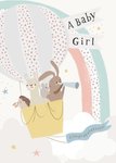 Featuring a cute illustration of animals in a hot air balloon against a soft sky background with scattered stars and a rainbow.