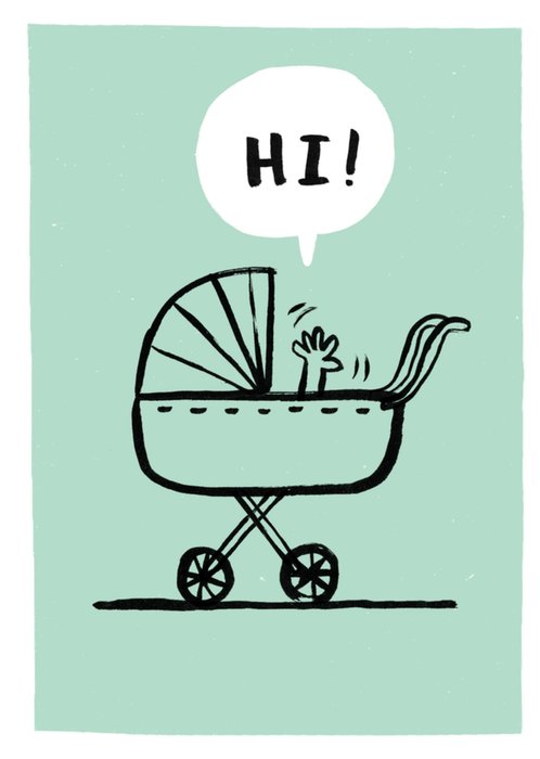 Featuring a simple line illustration of a pram with a waving hand and speech bubble coming out of it, on a light green background.