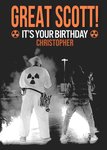 Front of Card: Retro style black and white of the Doc and Marty McFly. Text reads: "Great Scott! Its Your Birthday Christopher" The recipient name can be personalised. Rear of card features Back to the Future Logo