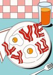 This vibrant greeting card features a bold, pop-art style breakfast scene with strips of bacon, sunny-side-up eggs, and a glass of orange juice, set against a retro checkerboard wall and pastel blue tabletop. The egg and bacon is arranged in such a way that it spells out the words ‘Love you’.