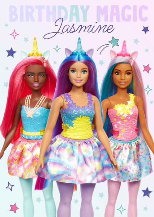 Features Barbie Dolls dressed up like unicorns surrounded by magical pastel star pattern and text.