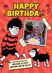 Featuring Dennis the Menace with Gnasher, a cheeky joke and 1 photo frame taped in a comic panel style, on a yellow and blue coloured background.