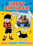 Featuring Dennis the Menace with Gnasher, a cheeky joke and 1 photo frame taped in a comic panel style, on a yellow and blue coloured background.