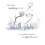 Features an illustration of a bear with a squirrel on its back. Text reads "That's what birthday are for... to remind you just how very special you are!".