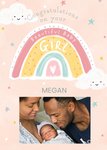 Front of card: Beautiful Baby Girl Photo Upload Congratulations Card Colourful rainbow surrounded by stars and clouds. Text reads: "Congratulations on your beautiful baby girl Megan". 'Megan' can be personalised!