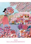 Front of card: Birthday Card Beautiful illustration of a lady buying a bouquet of flowers from a pink florist van. Text reads: "Mom have a beautiful birthday". All text can be personalised!