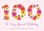 Front of card: Beautiful illustration of the number 100 made out of flowers, with pink text underneath that reads: A Very Special Birthday. Underneath that in grey is editable text: Text reads: "Wishing You A Wonderful Day Grandma" Back of card: Studio Sundae Ivy Cottage logo
