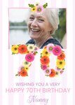Front of card: Beautiful illustration of the number 70 made out of flowers, with pink and orange text underneath that reads: "Wishing You A Very Happy 70th Birthday Mother". A photo upload frame is at the top of the card Back of card: Studio Sundae Ivy Cottage logo