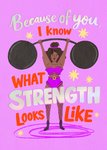 Featuring an illustrated strongwoman lifting a barbell with sparkling silver lettering and starbursts on a pink background.