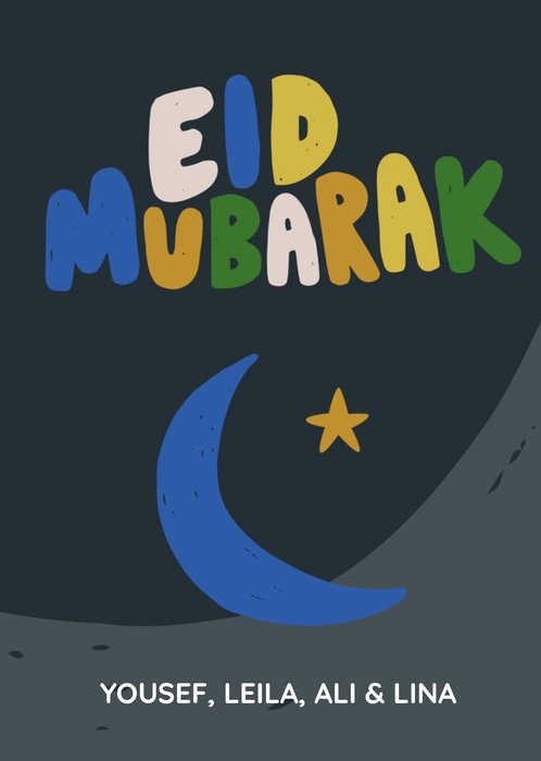 Front of card Illustration bold colourful lettering with Eid moon and star with text. Text reads "Eid Mubarak. Yousef, Leila, Ali & Linia". Editable names