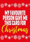 Funny card featuring white snowflakes, with black and red text on a red background.