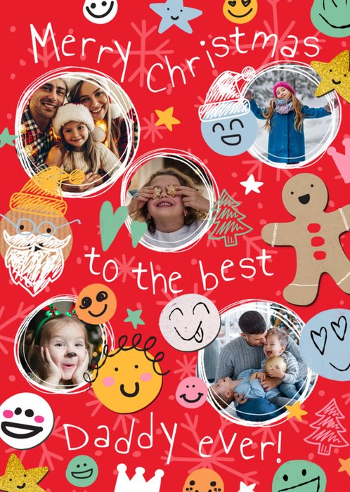 Featuring 5 circular photo frames surrounded by playful festive doodles, including a gingerbread figure, Santa hat, stars, smiley faces and snowflakes, on a red coloured background.br>