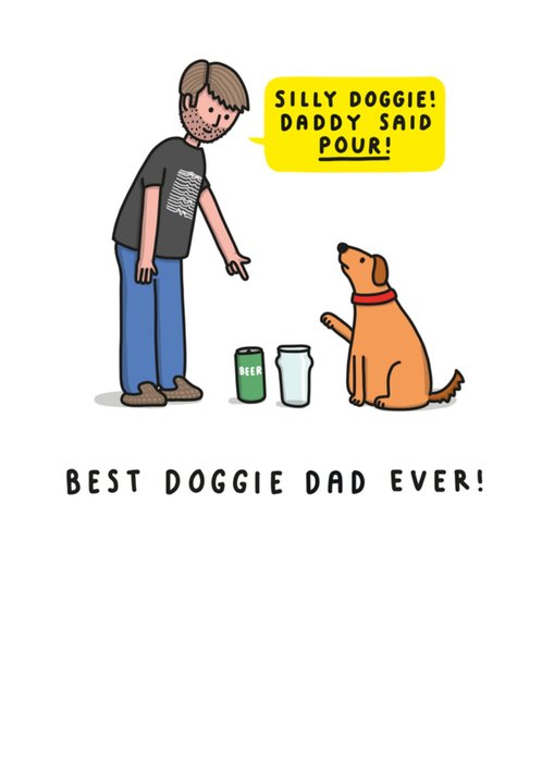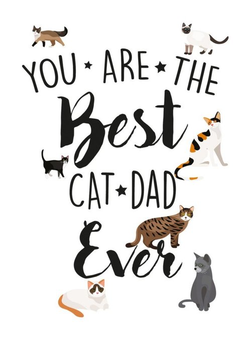 A vibrant and whimsical Father's Day card featuring a variety of colourfully illustrated dogs in playful poses, surrounding a large bone shape with the phrase "Best Dog Dad". Ideal for dog lovers and pet parents.