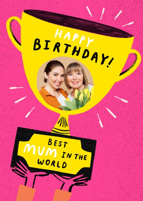 Front of card: Featuring a colourful illustration of a trophy being held up by two arms. The trophy contains a round photo upload and a Birthday message in blocky hand-drawn text. The design has a pink speckled background.
