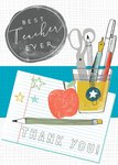 A stylish and thoughtful thank you card for a teacher featuring a chalkboard-style badge reading “Best Teacher Ever” alongside a desk scene of a pencil, red apple, stationery pot, and notepaper with a “Thank You!” message. The background has a subtle grid notebook pattern.