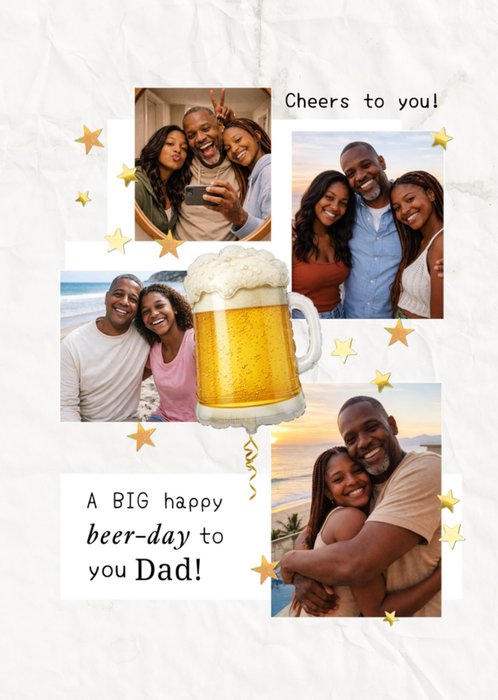 Featuring a collage of four rectangular photo upload areas, scattered gold stars, and a large illustrated beer mug on a light, textured background, this greeting card is designed for a birthday.