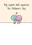 Front of card: Two simple hand drawn figures with smiling faces hug each other, with a red heart above them. Text reads: "Big squish and squeeze for Mother's Day."