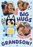 A sweet and playful Father’s Day card featuring Bluey and Bingo giving big hugs, surrounded by decorative elements like a foam finger, football, stars and toys. Includes three photo upload frames. The cheerful message makes it ideal for a young grandson to send to his grandad with love.